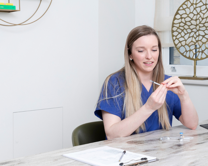 Consultant and patient sitting at a desk discussing PCOS and treatment options